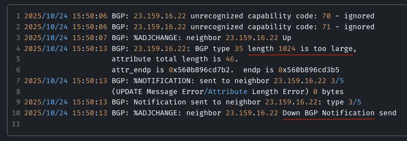 We recently ran into an unusual issue: BGP sessions were resetting with no obvious explanation shortly after routers received new routes. To understand what was happening, we collected and analyzed the BGP UPDATE messages that consistently triggered the errors.